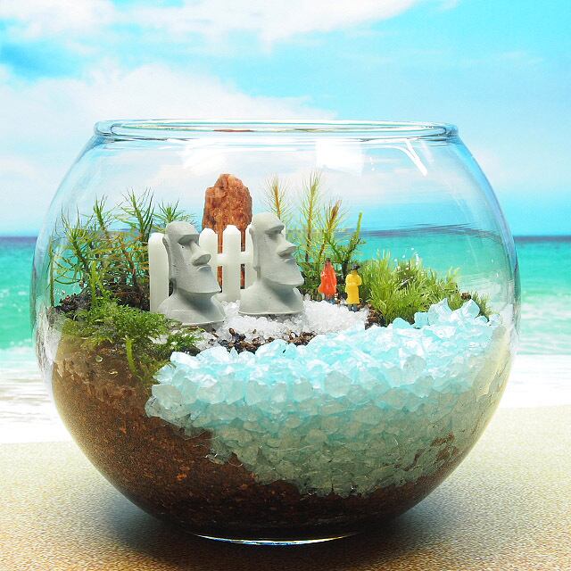 お手軽なモアイ像【苔テラリウム・手作りキット一式】金魚鉢です。