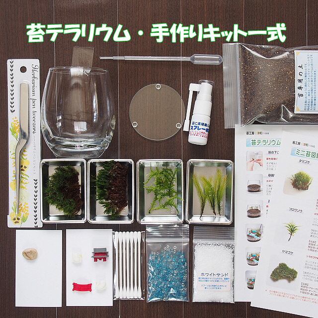 苔をはじめ、ガラス容器や材料・作り方のしおりの必要な材料が一式揃っているので